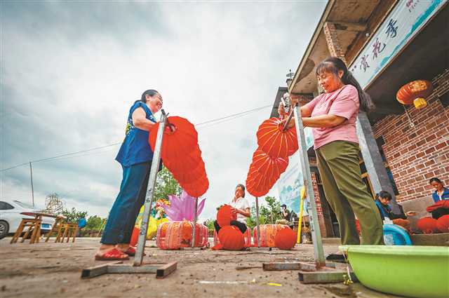 銅梁區太平鎮坪漆村龍燈彩扎基地,周建(右)和周光學(左)正在檢查制作好的燈籠是否達標。55歲的周光學是坪漆村的村民,跟著周建學習龍燈彩扎手藝,去年在家門口務工就增收6000多元。
