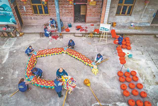 銅梁區太平鎮坪漆村龍燈彩扎基地,村民正在學習龍燈彩扎制作工藝,通過制作龍燈、燈籠等增收致富。